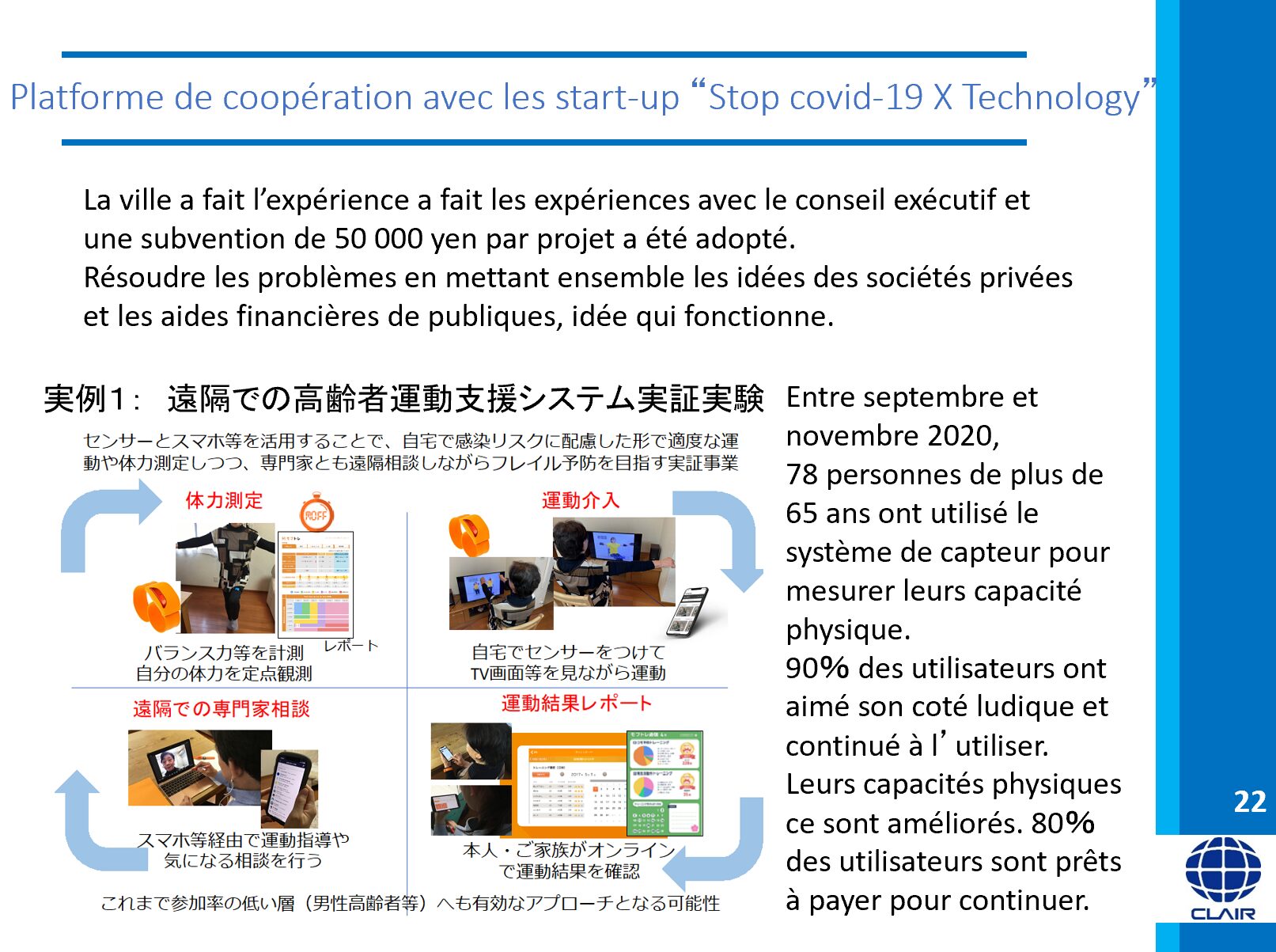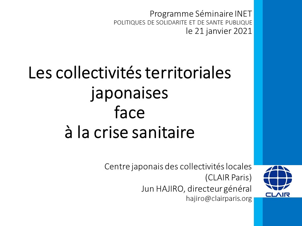 Le Directeur général de CLAIR Paris, Monsieur Jun HAJIRO, a présenté la situation japonaise, en commençant par l’état de la pandémie qui, bien que de niveau plus bas qu’en France, montrait des signes d’accélération au Japon. Après une explication générale concernant le système territorial japonais sur deux niveaux, les communes et les départements, et caractérisé par des fusions de communes de grande ampleur, Monsieur Hajiro a évoqué le rôle des collectivités au Japon, qui assument comparativement de nombreuses compétences selon les standards internationaux. Il a ensuite abordé leurs compétences en lien avec la crise sanitaire, et leurs responsabilités dans le domaine de la santé publique, ainsi que les coopérations entre collectivités, avec d’autres institutions ou avec des startups, et les efforts déployés pour mettre en place la vaccination. (Documents de l’intervention disponibles ici).