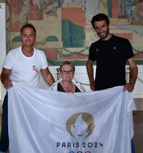 Béatrice Hess, multiple championne paralympique, Tony Estanguet, directeur COJO PARIS 2024, et Eric Kueny, conseiller territorial des APS directeur du service des sports de la mairie de Village-Neuf .