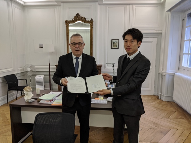 Masanobu Kinoshita, détaché de la ville de Takahashi chez CLAIR Paris, était porteur d’une lettre du maire de sa ville qu’il a remise au proviseur Philippe Grand. Il a également discuté avec lui de la forme à donner aux échanges à venir.
