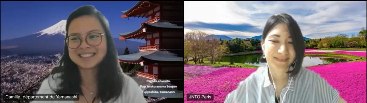 En collaboration avec le JNTO (Japan National Tourism Organisation), les participants français au programme JET (ci-après dénommés participants JET) ont réalisé des sessions de Facebook Live pour promouvoir les attraits de leur collectivité locale japonaise auprès des francophones. Ce projet s’est inspiré d’un événement de relations publiques en ligne déjà organisé en février 2021 par Mme Sakurako Nagira-Florentin, dirigeante de Florentin Consulting, entre Lucie Bourgeois, participante JET de la ville d’Izumo du département de Shimane et plusieurs voyagistes français spécialistes du Japon.