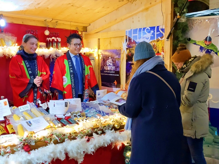 Pour commémorer le 50ème anniversaire de la relation de jumelage entre Sapporo et Munich, le stand de Sapporo est maintenant ouvert au marché de Noël de Munich sur la Marienplatz.