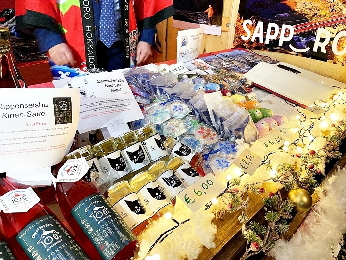 Les visiteurs peuvent acheter du saké Sapporo, du bouillon de soupe végétalien d’Hokkaido (Umami Konbu Dashi), des gelées et d’autres articles que l’on ne trouve pas habituellement à Munich, en Allemagne. Un saké en édition limitée célébrant le 100e anniversaire du statut de métropole de la ville de Sapporo est également disponible.