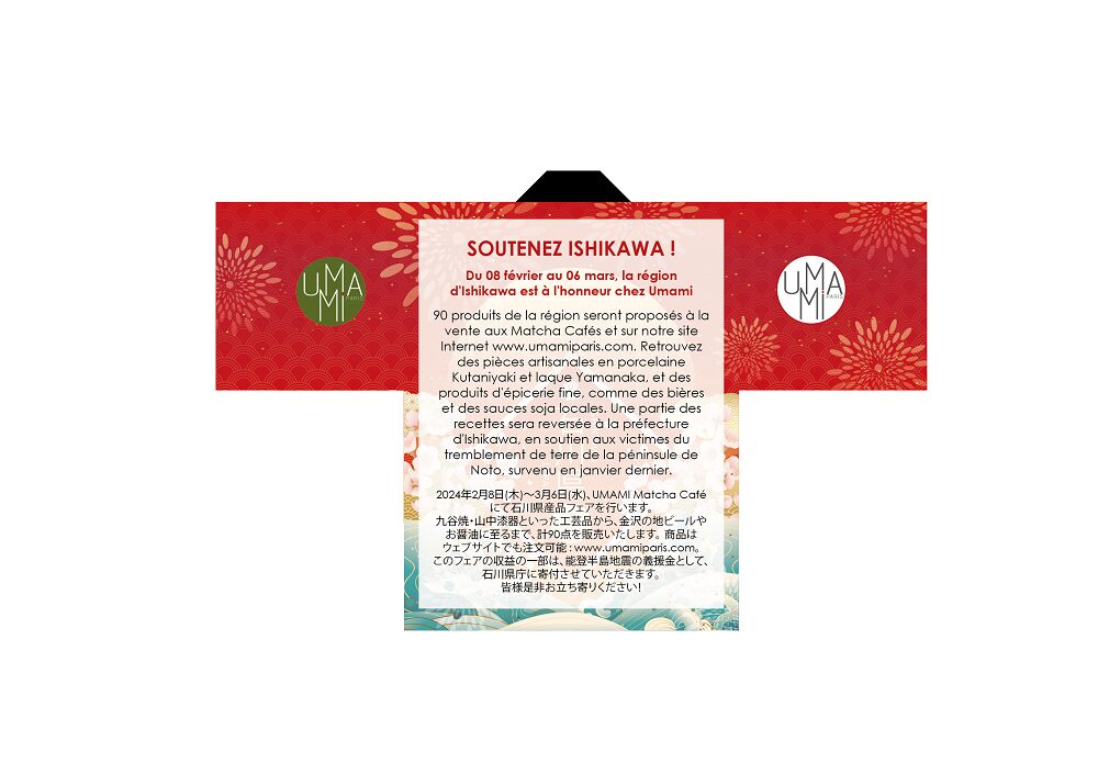 90 produits de la région seront proposés à la vente aux Matcha Café et sur notre site Internet www.umamiparis.com. Retrouvez des pièces artisanales en porcelaine Kutaniyaki et laque Yamanaka, et des produits d’épicerie fine, comme des bières et des sauces soja locales. Une partie des recettes sera reversée à la préfecture d’Ishikawa, en soutien aux victimes du tremlement de terre de la péninsule de Noto, surveau en janvier dernier.