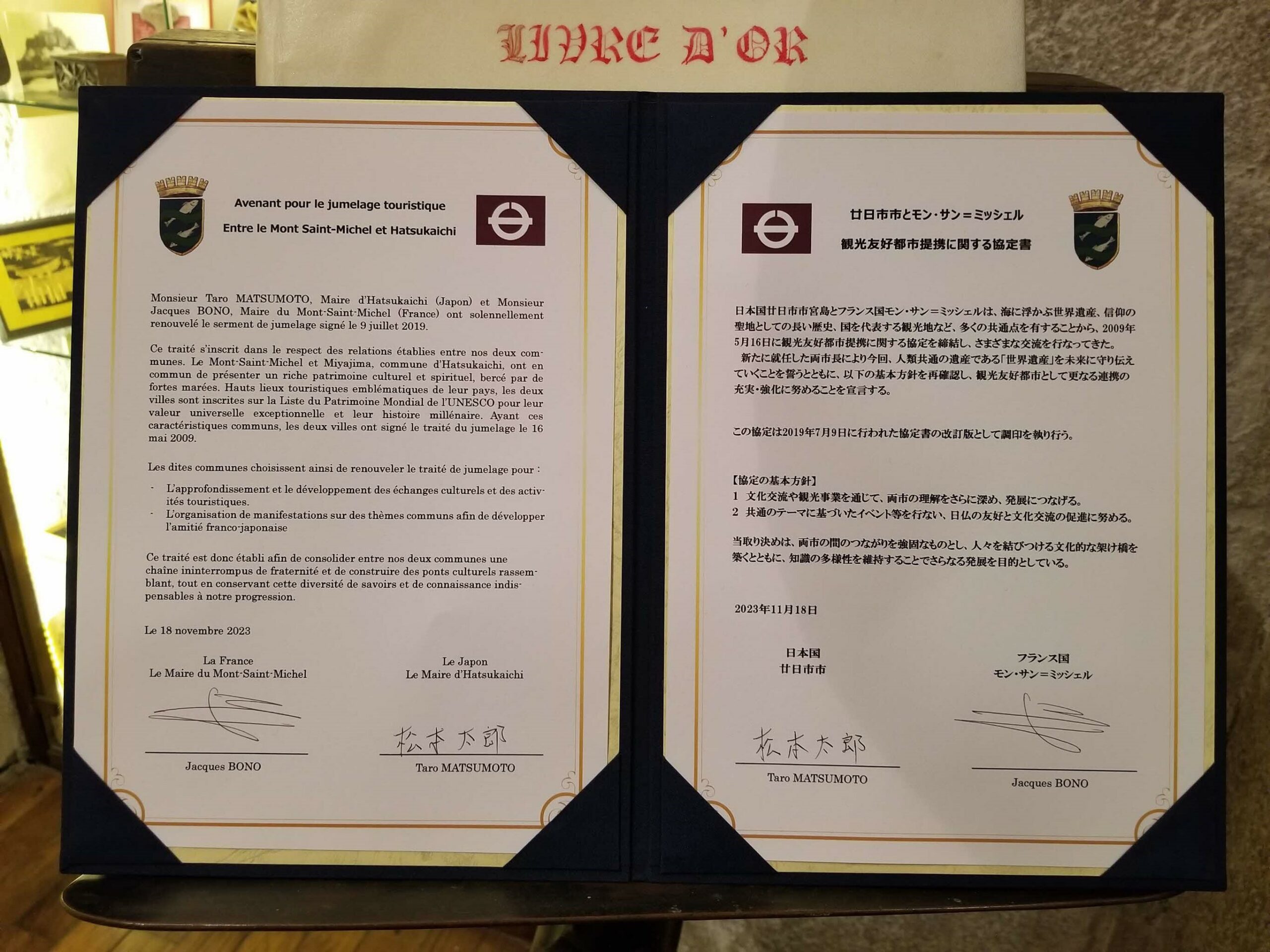 Par ailleurs, dans le cadre de l’opération destinée à promouvoir le patrimoine gastronomique à l’occasion de l’Exposition Universelle d’Osaka de 2025, nous aimerions organiser un grand événement autour d’échanges gastronomiques auxquels prendront par des chefs japonais et français grâce à un travail de coordination en amont de la part des Escoffier franco-japonais. Dans le même ordre d’idée, l’année 2026 marquera le trentième anniversaire de l’inscription du sanctuaire d’Itsuku-shima (symbole de la ville de Hatsukaichi) sur la liste du patrimoine mondial de l’UNESCO, tandis que l’année 2029 sera à la fois celle du cinquantième anniversaire de l’inscription du Mont-Saint-Michel au patrimoine de l’Humanité et celle du vingtième anniversaire de l’accord de coopération liant les deux célèbres collectivités.