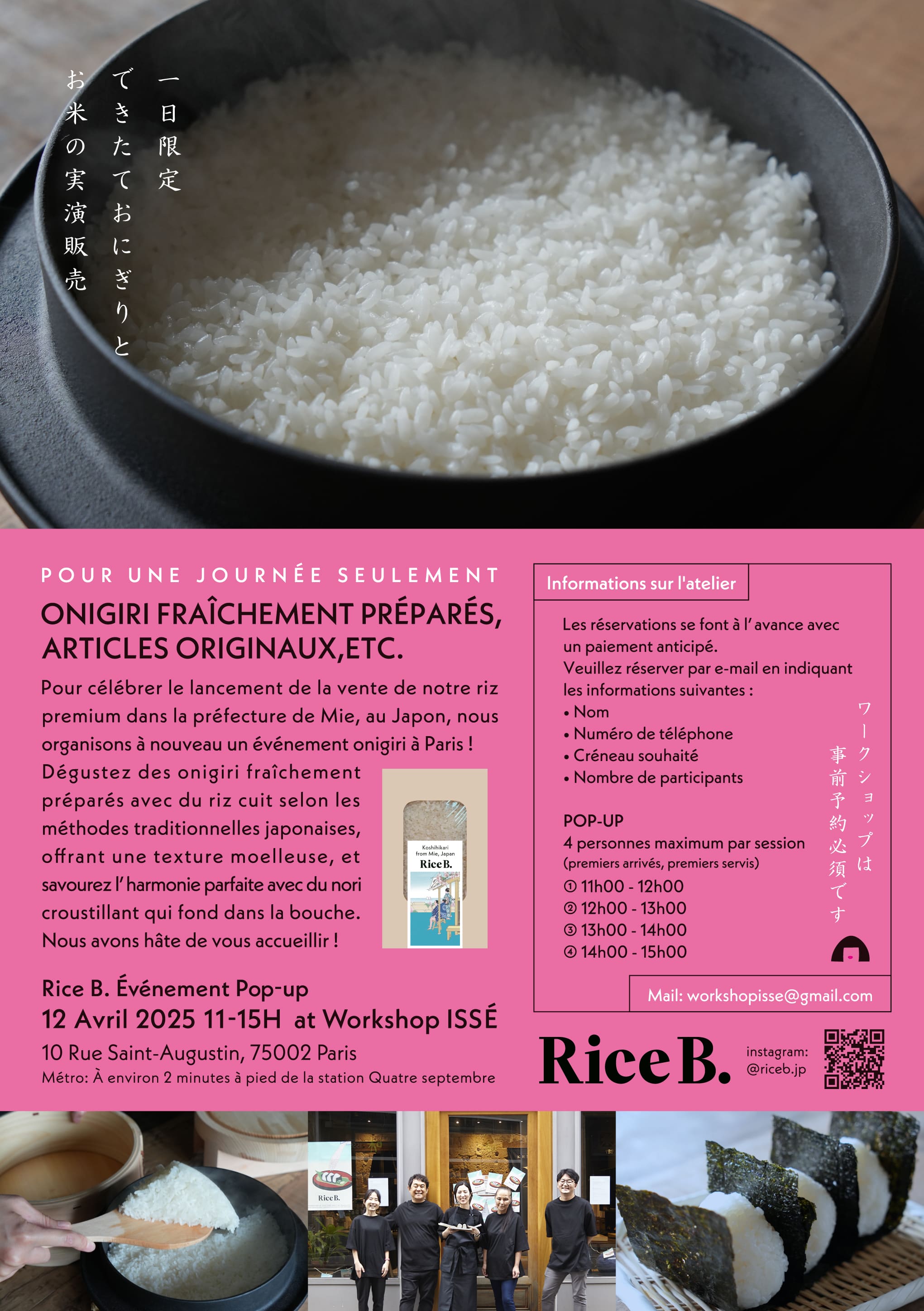 La marque de produits alimentaires « Rice B. », qui promeut l’attrait de la gastronomie japonaise, organisera un événement éphémère au workshop Issé dans le 2e arrondissement de Paris le samedi 12 avril 2025.