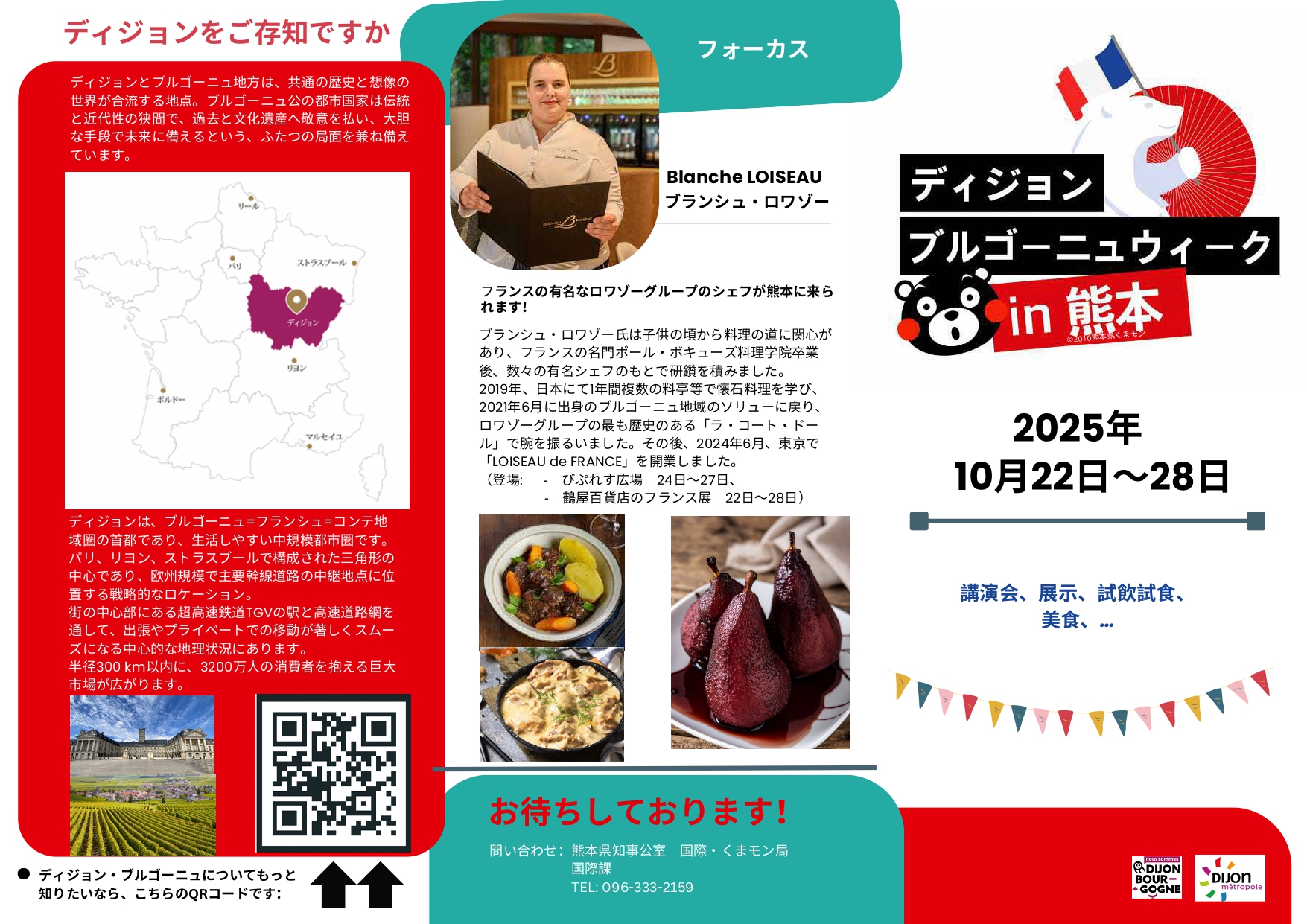 Dijon métropole poursuit sa coopération avec le département de Kumamoto (Japon) et organise, du 22 au 29 octobre 2025, la Semaine Dijon Bourgogne : une opération de promotion territoriale alliant gastronomie, culture, économie, recherche et enseignement supérieur.