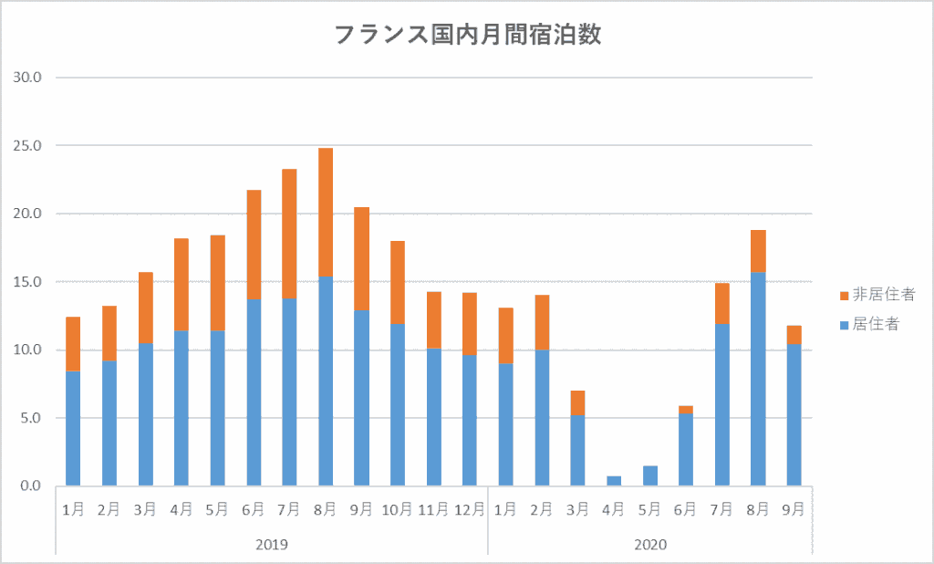 バカンス期の観光状況全体としては、外需は落ち込んだものの、仏国民の選好を受け、国内旅行の7月・8月の宿泊数は前年に匹敵するなど内需に大きく支えられ、春時点での予測よりは良い結果をもたらした。