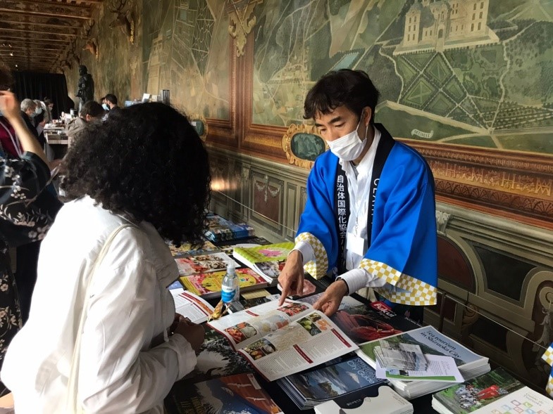 本イベントは、仏文化省、フォンテーヌブロー城及び国立美術史研究所の主催により世界遺産として登録されているフォンテーヌブロー城及び周縁において、コロナ禍後初のフランス政府の公式行事として開催され、会期中は約20,000人の来場者が訪れました。第10回目となる本イベントは、欧米以外では初めて日本が招待国となり、「喜び(Plaisir)」をテーマに230以上プログラムが用意され、若者からお年寄りまで実に多くの方々が参加しました。初日には、イベントの成功と日本の魅力発信のため、伊原純一在フランス日本国大使がクレアパリ・兵庫県ブースを激励に訪れたほか、ブースには全3日間で約550名の方が訪問してくださいました。