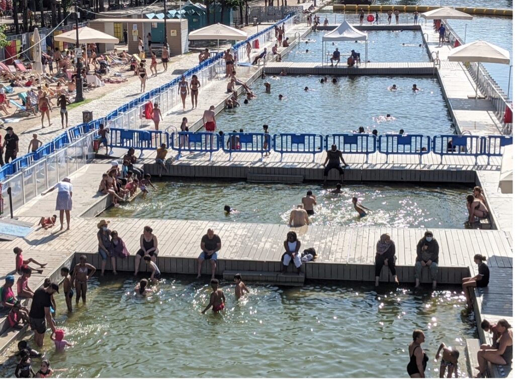 パリプラージュの中でもう一つの目玉となっているのが、パリ市内を流れる運河の中に設けられるプールです。運河(正確にはサンマルタン運河とウルク運河との間にあるヴィレット貯水池)の一部を区切ってプールが作られ、イベント期間中無料で市民に開放されています。プールの運営にあたっては、定期的な水質チェックが行われるほか、コロナ禍にあっては感染症の拡大防止のため2時間単位で入場時間を区切り入場者数を制限するなどの対策が採られています。