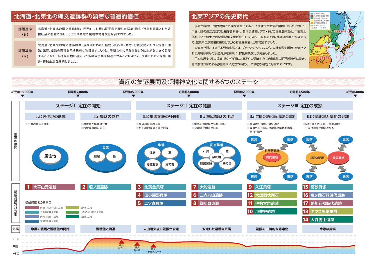 縄文遺跡群が存続した紀元前13,000年から紀元前400年までの時期は、日本の歴史では縄文時代と呼ばれています。氷期が終わり、地球規模で温暖化すると、北日本にはブナを中心とする落葉広葉樹の森が広がり、海洋では暖流と寒流が交わり豊かな漁場が生まれました。人々は、気候の温暖化や寒冷化といった環境変化にも適応しながら、1万年以上にわたって農耕文化に移行することなく、狩猟・漁労・採集を基盤とした生活を継続しました。17の遺跡は、その開始・発展・成熟の過程を具体的に示しています。