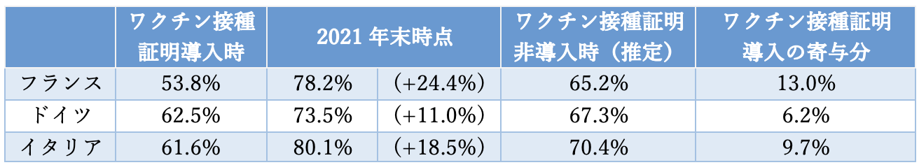 各国においてワクチン接種証明が導入された時点でのワクチン接種率(少なくとも1回の接種を受けた率)は、フランスは人口の53.8%(21年7月)、ドイツでは62.5%(21年8月)、イタリアでは61.6%(21年7月)だったのに対し、2021年末ではフランスは78.2%(+24.4%)、ドイツは73.5%(+11.0%)、イタリアは80.1%(18.5%)までそれぞれ上昇しています。仮にワクチン接種証明が導入されていなかった場合には、各国での接種率はフランスでは65.2%、ドイツでは67.3%、イタリアでは70.4%に留まっていたと推定されており、ワクチン接種証明導入によって、フランスで13.0%、ドイツで6.2%、イタリア9.7%、それぞれワクチン接種が促進されたことになります。