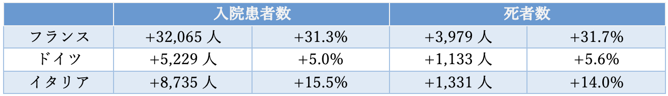 ワクチン接種証明が導入されなかった場合、フランスでは32,065人、ドイツでは5,229人、イタリアでは8,735人、それぞれ2021年末までの入院患者数が実際より増加していたものと試算されています。この試算に基づけば、ワクチン接種証明の導入がなかった場合、フランスでは31.3%、ドイツでは5.0%、イタリアでは15.5%、入院患者数が増加していたことになります。また、死者数については、フランスでは3,979人(31.7%)、ドイツでは1,133人(5.6%)、イタリアでは1,331人(14.0%)実際より増加していたとされています。