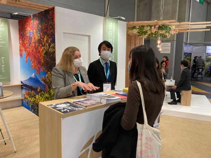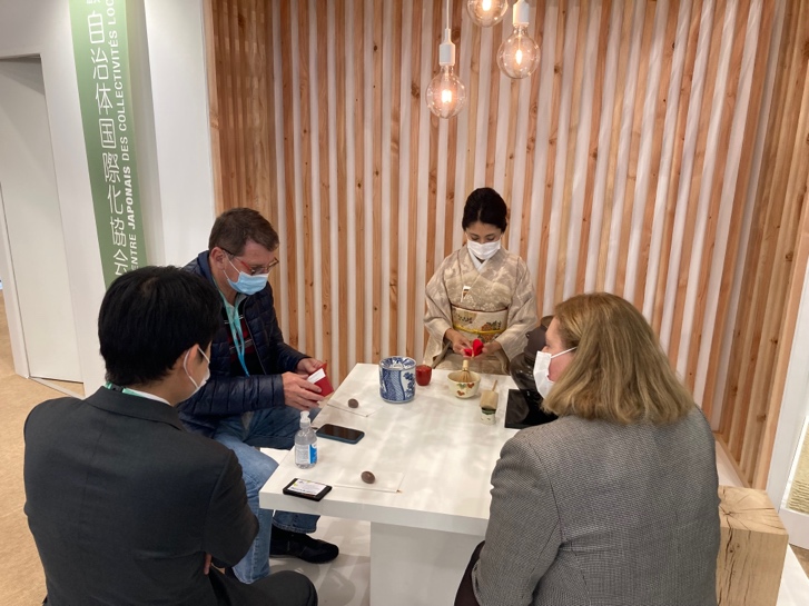 クレアパリ事務所は、2002年から継続してこの見本市に出展しています。フランス全土の市長や副市長に対して日仏自治体の交流推進や日本の自治体のPRを対面で行うことができるので、クレアパリ事務所にとっては貴重な活動の機会となっています。そのため、ブースを訪れた方が日本らしさを感じられるものとなるようにデザインにもこだわっています。ブース内では、日本文化に触れていただきながら腰を落ち着けて訪問者とじっくり話ができるようにとの思いから、日本茶と和菓子によるおもてなしを毎回実施しています。ワインやチーズなどを振る舞うブースは他にも沢山ありますが、日本ならではの茶道のデモンストレーションは、今年も来場者の注目を集め、多くの人々が立ち止まってお点前の様子を眺めたり写真を撮影したりする様子が見られました。