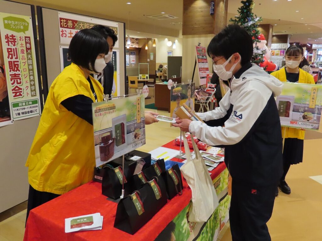 大館市立東中学校では、地域を活性化させる活動として、花善×東中コラボ「お土産品開発プロジェクト」が行われました。このプロジェクトは、「コロナ禍で落ち込んだ大館を元気にする」という目標のもと、前年度発足しました。今年度は、パリ・リヨン駅での鶏めし販売に合わせて、お土産品を商品開発することになり、全校のモチベーションは跳ね上がりました。企画書を全校から募集し、プロジェクトメンバーが話し合いを重ねました。フランス人の花善現地スタッフの方とWeb会議を行い、パリの方々にも人気のある「お茶」に決定しました。その方は、日本語がとても上手で、やはり、世界で羽ばたいていくためには、語学を身につける必要があること、広い視野で物事を見ることの大切さを改めて感じることができました。お茶の味を決めるのは、市内のお茶専門店の森田康裕社長から、たくさんのことを教えてもらいながら試飲を繰り返し、鶏めしに合うお茶の味を決めました。商品名も「鶏めしが恋したプレミアム駅弁茶」とし、東中生のアイデアと思いのこもった世界でただ一つのお茶が誕生しました。ネーミング、パッケージデザイン、PRのポスター制作と、たくさんのプロにアドバイスをもらいながら完成にこぎつけました。