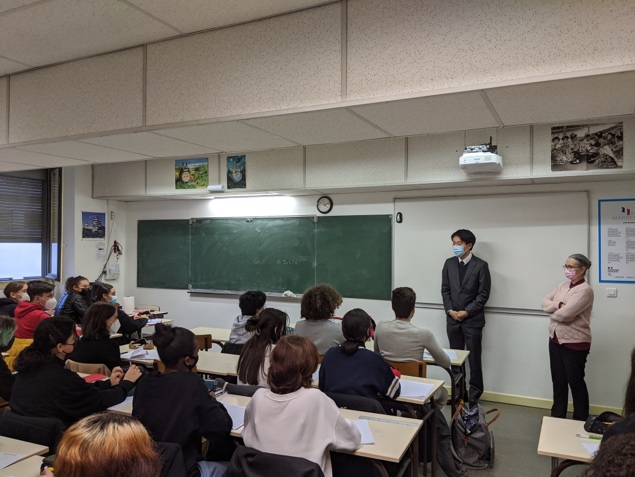 また、今回の訪問では、高校1年生の日本語クラスの授業を見学させていただきました。熱心に日本語を学ぶ学生たちの姿を見て、高梁市の高校生を早くアンペール高校に連れて来てあげたいという思いを新たにしました。リアルタイムでのオンライン交流には、時差(日本とフランスの時差は7~8時間)の関係から難しい面もありますが、アンペール高校と高梁市との交流促進のため、お互いの知恵を出し合って良い案を模索していきたいと考えています。今後の両者の交流促進のため、クレアパリは引き続き支援して参ります。