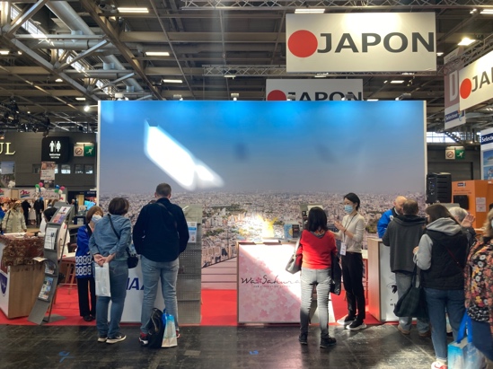 クレアパリ事務所は、岡山県から活動支援依頼を受けて、ジャパンブースに共同出展した「WASAKURA」ブースに参加。このブースでは、西日本の島根県、岡山県、広島県、神戸市の観光情報を取り扱っており、来場者に向けて各地域の観光PRを行いました。観光PRを行う中で、足立美術館の日本庭園(島根県)、厳島神社(広島県)、日本刀で有名な備前長船刀剣博物館(岡山県)、神戸牛(神戸市)が、それぞれ特に来場者の関心を集めていました。1日あたり約250名の来場がありましたが、そのほとんどは退職後のシニア世代で、再び日本を観光できる日を待ち望んでいるようでした。