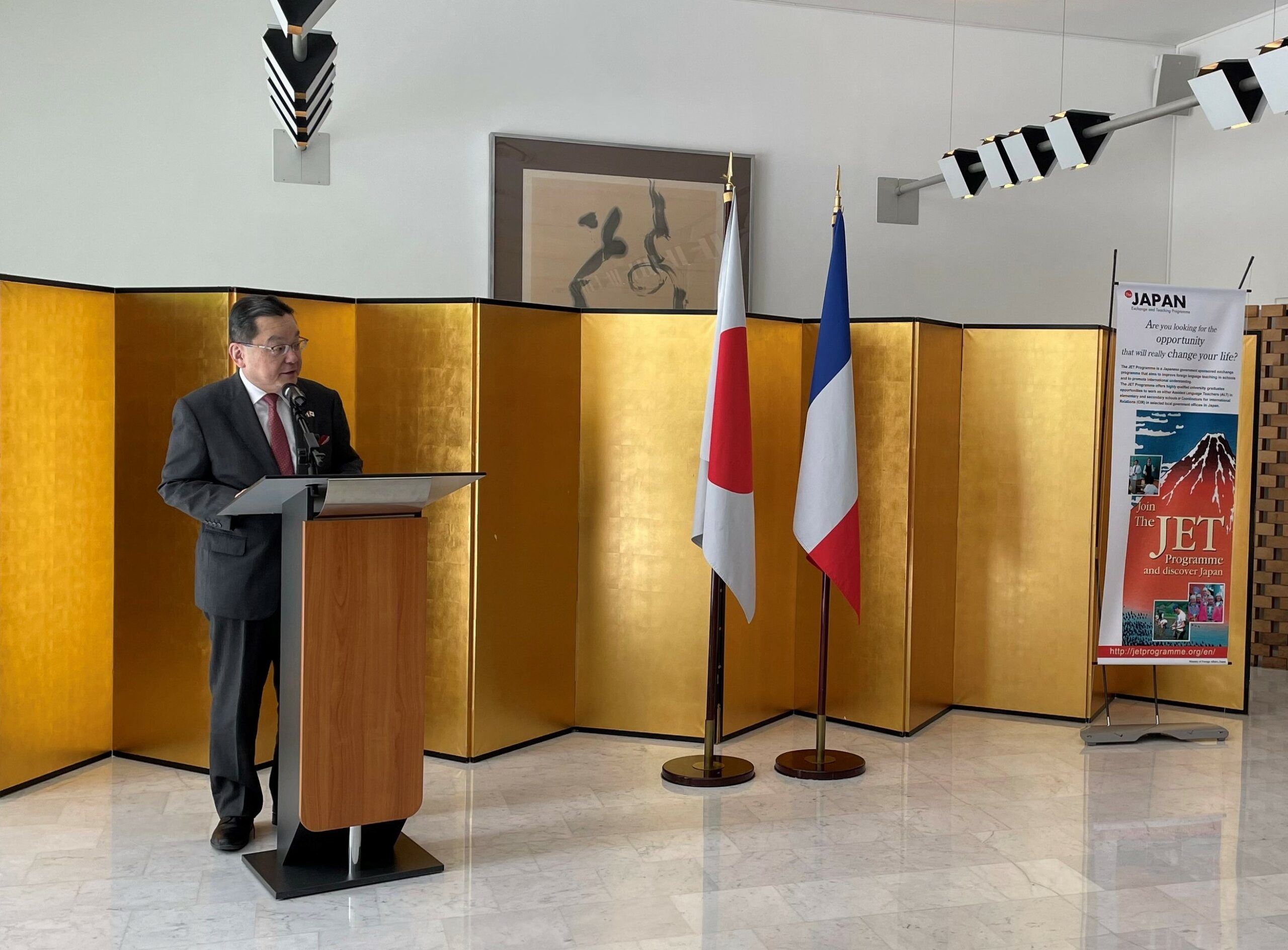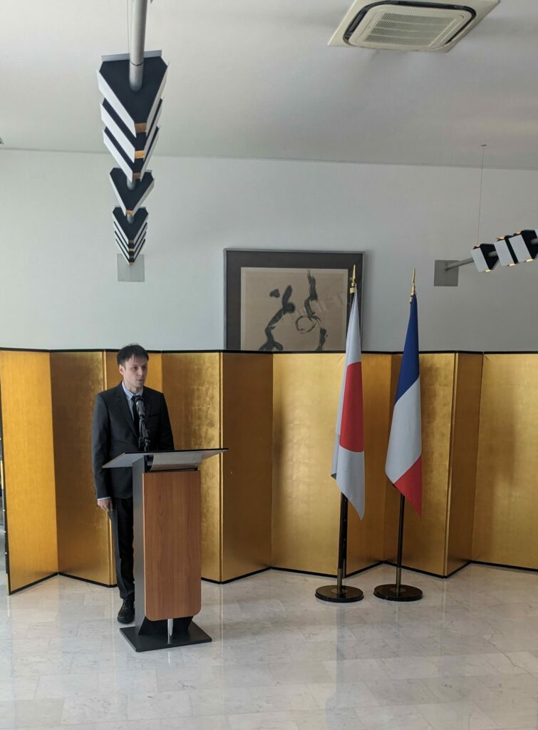 在フランス日本国大使館主催壮行レセプションでは、下川 眞樹太(しもかわ まきた) 駐フランス日本国大使及びクレアパリ野村所長から、参加者たちへ激励の言葉が贈られました。レセプションには、JETAAメンバーをはじめ、フランス高等教育機関や在仏日本企業、報道関係者も出席し、日仏交流の新たな担い手を盛大に壮行しました。参加者たちは多くの激励を受け、日本での仕事や生活に期待を膨らませていました。
