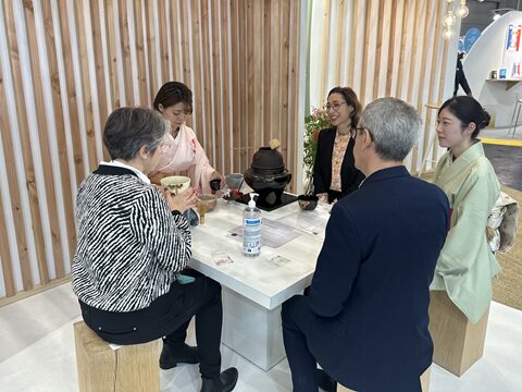 また、クレアのブースでは毎年、日本文化に触れていただきたいという想いから抹茶と和菓子によるおもてなしを実施しております。皆様に日本文化を楽しんでいただきながら腰を据えて意見交換を行うことで、これまでクレアブースにおいて日本とフランスを結ぶたくさんのつながりが生まれてきました。
