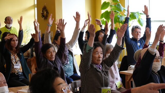 まず高梁市役所健康福祉部の担当者から介護予防の取り組みについて説明を受け、地域ボランティアで運営する通所型施設を訪問し利用者と交流しました。