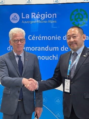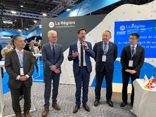 すると、3月上旬に来日中のオーヴェルニュ=ローヌ=アルプ州のLaurent Wauquiez議長と平澤町長が偶然お会いしたことで事態は急展開。Wauquiez議長の後押しにより、グルノーブルでの山岳リゾート産業の国際展示会「Mountain Planet」の期間中、州のブースでMOU締結を行うための調整が始まりました。