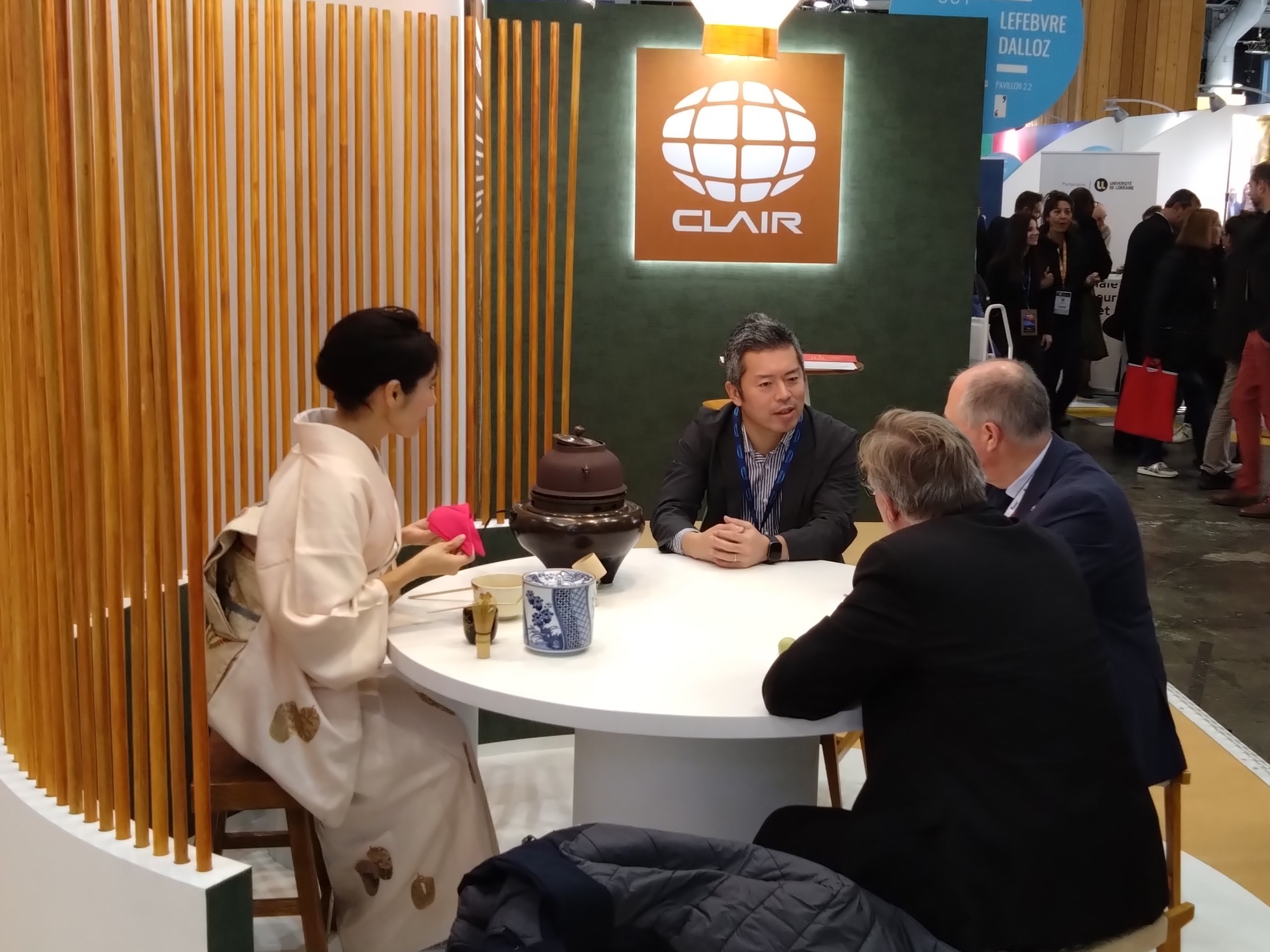 今回のクレアパリのブースは、白と木を基調としたブースで、昨年同様、来場者に日本文化を知ってもらうため、ブース中央に茶席を設けて、抹茶と和菓子を振舞いました。