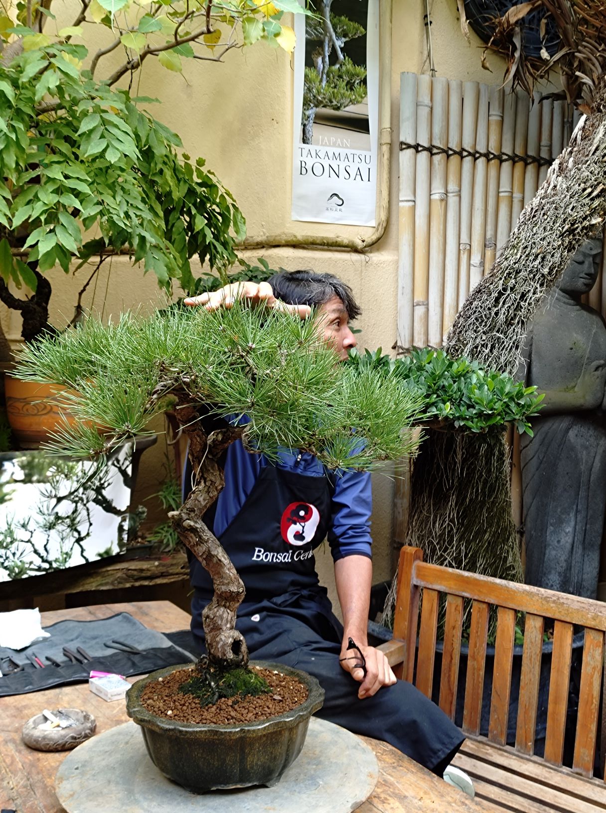 ニースの盆栽販売業者であるニース盆栽センターにおいて、地元の盆栽クラブ役員や顧客を招待し、尾路会長による高松盆栽の紹介と平松氏によるデモンストレーションを行いました。平松氏ならではの盆栽の世界観を表現いただき、特に木の枝に枯れた部分を作り、自然の厳しさを表現し、盆栽に独特の風格と深みを与える「神(ジン)」や、針金を使って枝を調整する工程は、参加者に強い印象を与えました。