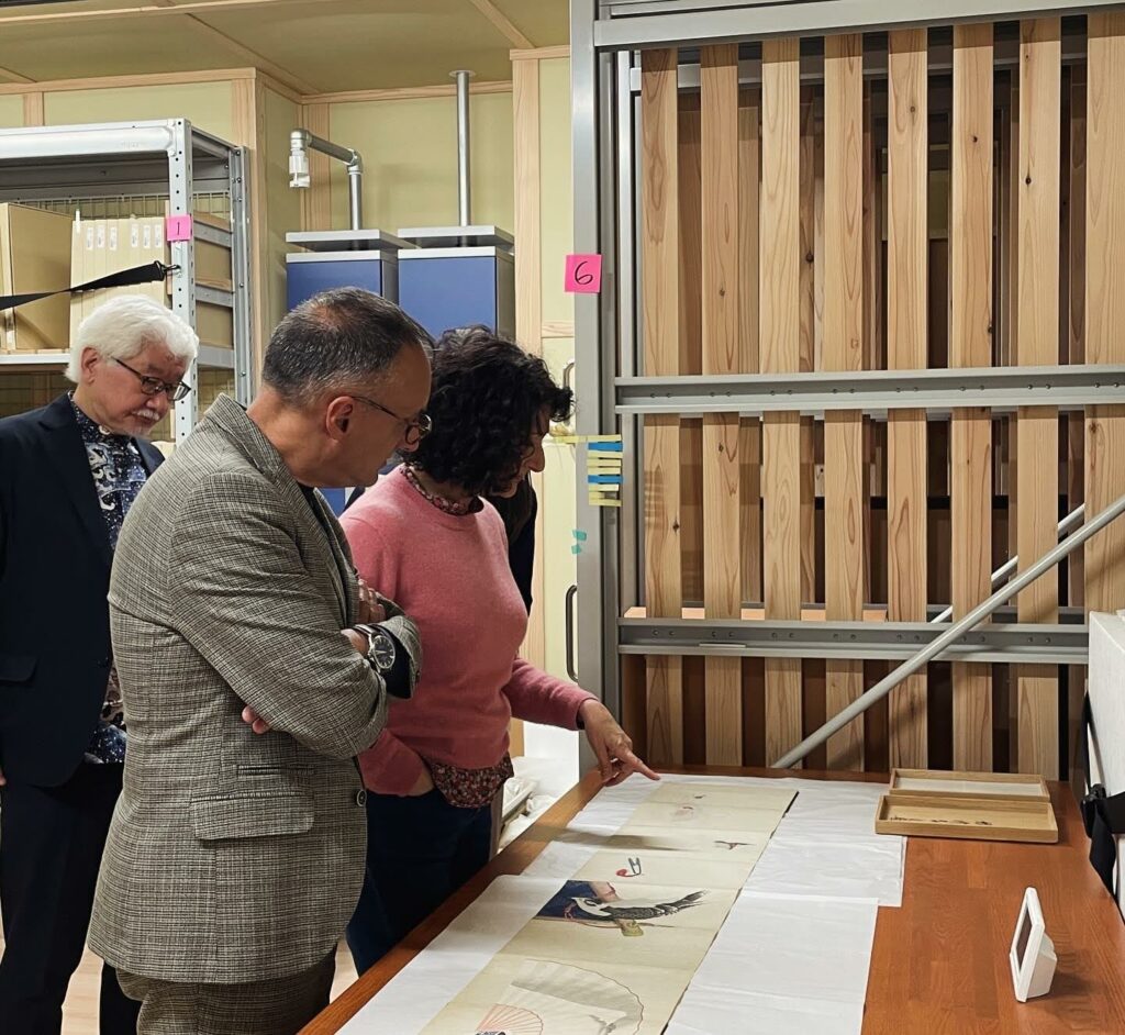 北斎館 館長の安村敏信(左)と、肉筆画を詳細検討するベトランド・ギエ館長(中央) 画像提供:北斎館