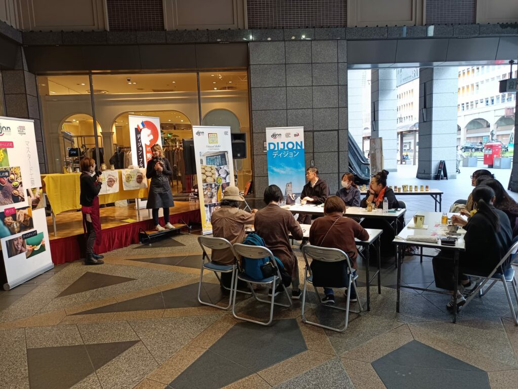 一週間を通して、熊本の中心部にあるびぷれす広場では、ディジョンのノウハウと魅力を紹介するさまざまなイベントが開催されました。九州日仏学館、ディジョン・ブルゴーニュ観光協会、シェフのブランシュ・ロワゾー氏、ブルゴーニュ=フランシュ=コンテ地方美食産品協会(GPPR)が、フランス語と日本語で地域の特産品や名物を紹介しました。毎日開催された「マスタード」ワークショップは大好評で、2回の一般向け講演会では、この大都市の歴史、文化、観光名所を紹介しました。