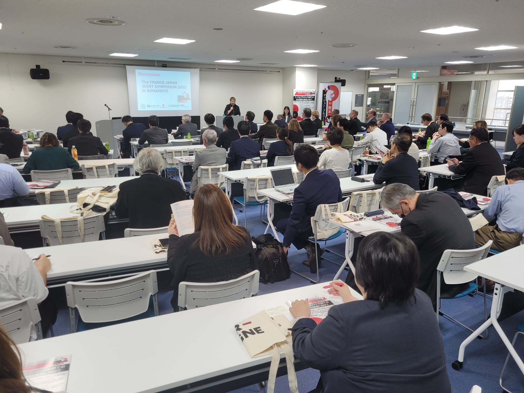 今回のディジョン・ブルゴーニュ週間では、科学分野のプログラムとして、10月24日に食品産業イノベーションクラスターのVITAGORA、九州バイオクラスター推進協議会(KBCC)、崇城大学、くまもと技術革新・融合研究会(RIST)、国立研究開発法人農業・食品産業技術総合研究機構(NARO)が共催した「日仏連携シンポジウム2025 inくまもと」が開催されました。「食品と農業技術で日仏協力を進める」をテーマとしたこのシンポジウムには、60名以上の参加者が集まりました。開会式には、NAROの久間和生理事長やVITAGORAのクリストフ・ブルイエ部長などが参加し、日仏パートナーシップの重要性について改めて認識を深めました。続いて、ファブリス・ネイア教授(UBE – CLGA)とフロリアン・ハンバート氏(UBE – IUVV)の研究発表が行われ、活発な意見交換が行われました。