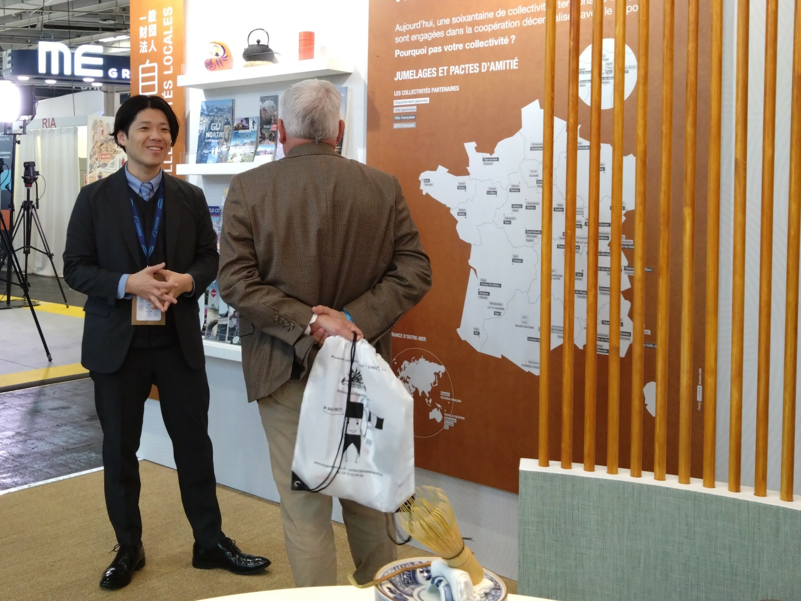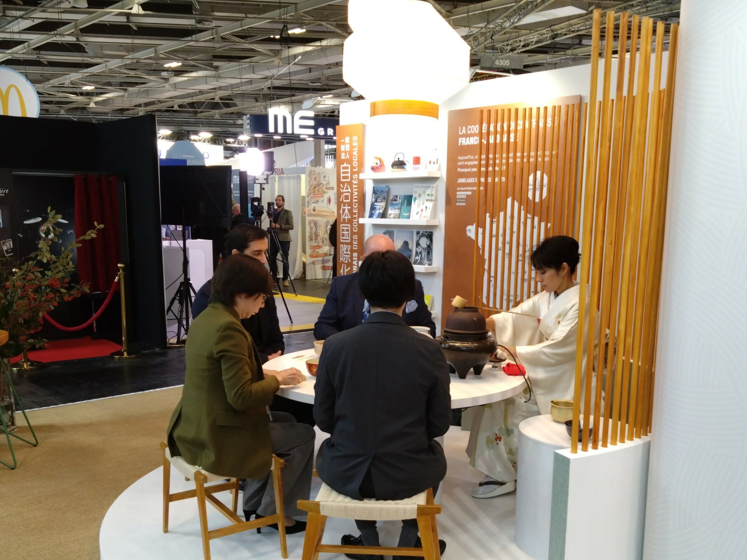 昨年同様、クレアパリのブースは白と木を基調とした和を感じられる空間とし、その点でも来場者の目を引くものとなりました。さらに、他のブースと大きく異なる特徴として、ブース中央に茶席を設けていることが挙げられます。これはフランス各地から訪れる首長や自治体関係者と、和やかな雰囲気の中で円滑なコミュニケーションを図ることを目的としたもので、抹茶と和菓子によるおもてなしを行いました。